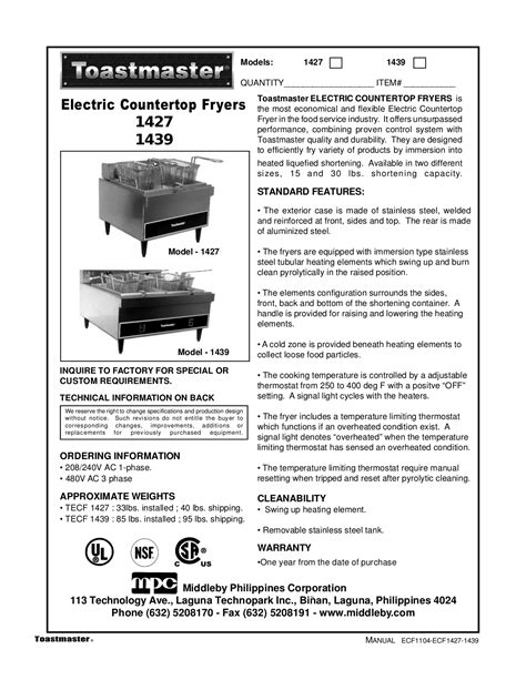 Download free pdf for Toastmaster TECF1427 Fryer Other manual from www.umlib.com