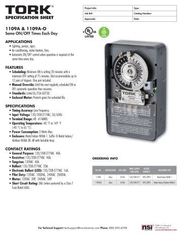 Web Tork 1109A Mechanical Lighting Timer Guide.air Conditioning, Water Heaters, Fans.