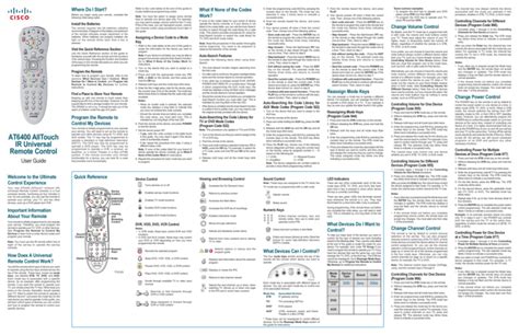 Universal Remote Control Guide Cisco Logo. This way you’ll save time. Web page 1 ™ ® your new at6400 alltouch infrared (ir) universal remote control (remote) is a true device universal remote, functioning as four remotes in control one.